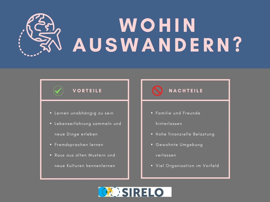 Haben Sie schon einmal darüber nachgedacht, welche Vor- bzw. Nachteile Sie haben, wenn Sie auswandern? Wenn Sie sich dazu entscheiden in ein fremdes Land umzuziehen, sollte das gut überlegt sein. Die nachfolgende Grafik hilft Ihnen dabei zu reflektieren, ob Sie bereit sind in ein fremdes Land auszuwandern.